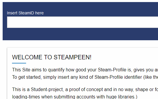 Steampeen ist ein Webtool mit dem Ziel die Spielebibliothek eines Nutzers des Steam-Store zu bewerten. Die Umsetzung dieses Projektes geschah im Rahmen eines Projekt-Seminars mit dem Titel „Daten- und Informationsmanagement“ unter der Leitung von Prof. Dr. Stefan Schmunk und Andreas Schieberle.